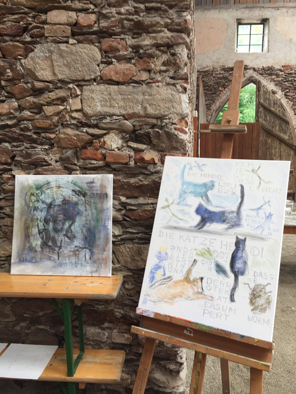 Dieses Bild ist sehr schnell entstanden (2019, in Feistritz). Worte und Bilder geraten durcheinander, die Realität wird aufgelöst, Katzen und Menschen beginnen zu fliegen. Diese Leichtigkeit wünsche ich den Menschen und auch den Katzen, die ich in letzter Zeit verloren habe.